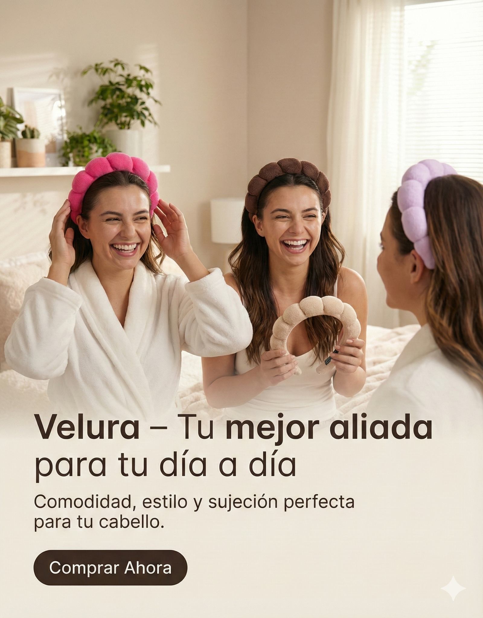 "Trabajo 12 horas y mi peinado se mantiene impecable. Velura es suave, elegante y no lastima. Lo recomiendo 100%."
